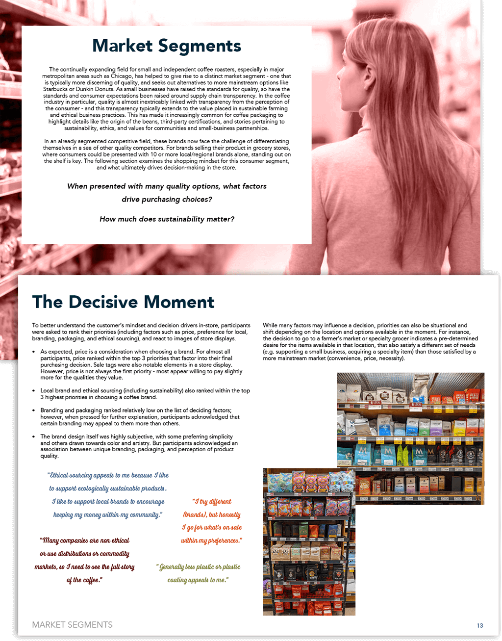 Surveys were then conducted among potential customers—those who brew coffee at home, and live in a metropolitan area with many independent coffee brands—and specifically the likely customer base for Metric and its close competitors—those who prefer small independent coffee shops over large chains, those who shop at specialty markets, and those who might choose a product for its ethical or sustainable business practices. These surveys revealed what priorities factor into their decision-making when choosing a coffee brand in-store. While the type of packaging ranked lower compared to price and quality, responders did prefer ethical sourcing and acknowledged the branding having an influence on their perception of product quality.
