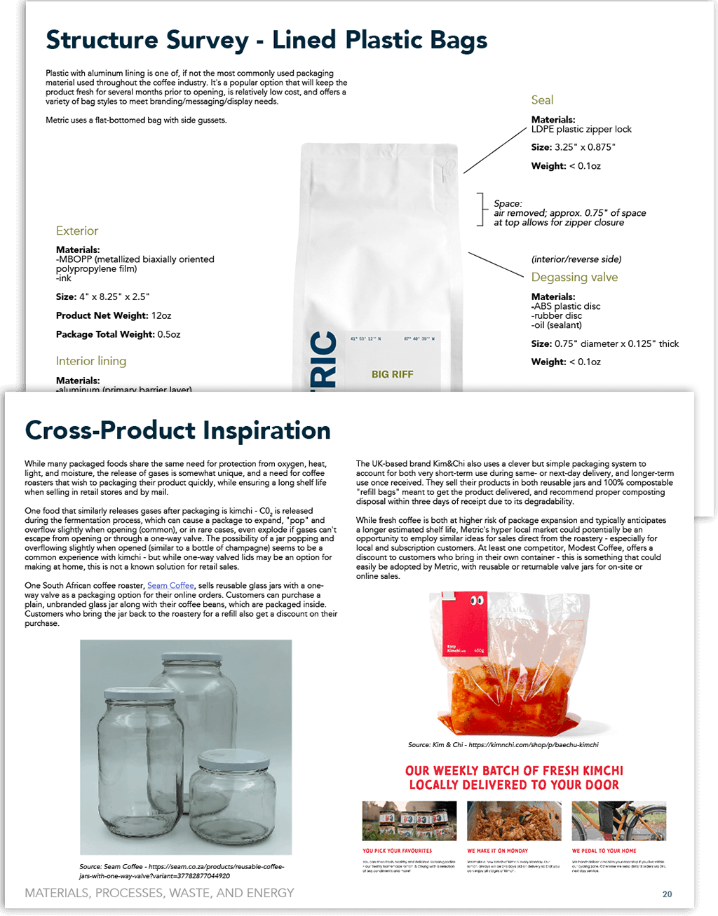 The lined bags used by Metric and the vast majority of coffee brands was also analyzed and compared to other types of coffee packaging to determine if a more sustainable option was readily available. To be an appealing alternative for Metric, the materials needed to meet the needs of a small-scale roaster, namely comparable pricing for both the product and distribution, and similar ability to preserve the product quality. From a sustainability perspective, opportunities to improve upon a standard coffee bag would need to look at the entire lifecycle of the package, from raw material extraction to manufacturing processes, transport, use, and end of life in the Chicago area where the product is sold. Since most coffee packaging is typically made of mixed materials, this would also need to be a consideration when weighing recycling vs. composting at its end of life.